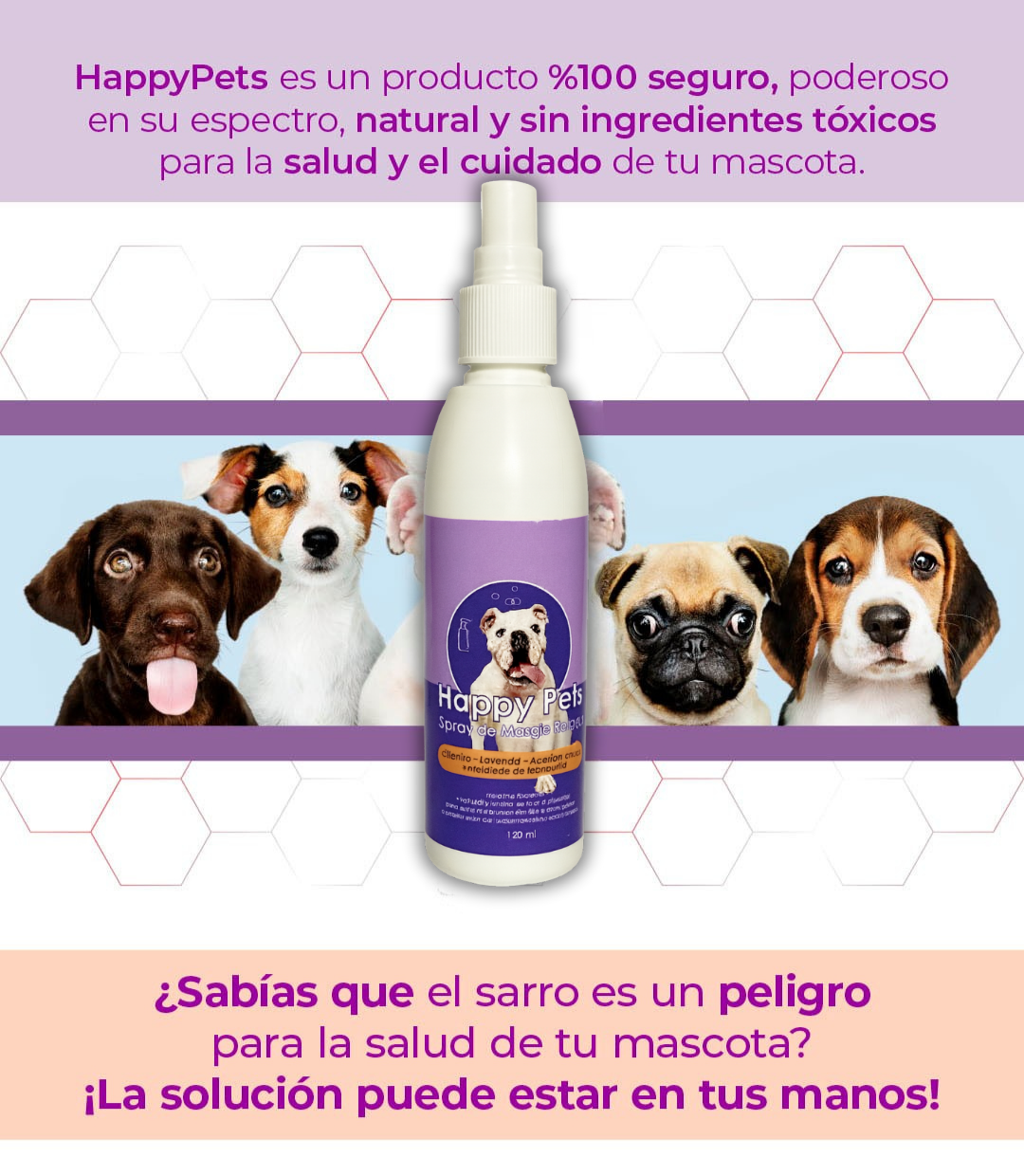 Happy Pets es un spray relajante natural para perros, formulado con extractos calmantes que ayudan a reducir el estrés, la ansiedad y la agitación. Ideal para momentos de tensión como viajes, ruidos fuertes o visitas al veterinario.